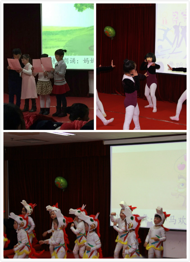 在亮丽的海报签到处,大家都在签名版上留下了自己的名字,并拿取了号码牌,不一会,小小主持人就开始主持啦,同时也预示着年会也正式开始啦!首先是暖场节目,由一名家长给大家表演朝鲜族舞蹈桔梗谣,精美的衣服,优雅的舞蹈,很快就征服了现场的观众,赢得了片片掌声。将大家的兴奋度提到了一个小高潮,接下来就是孩子们的表演,有小马过新年的群舞,有可爱的飞扬的小蜜蜂,有深情并茂的诗歌朗诵,还有一招一式都很像回事的跆拳道表演,特别要提到的是一个才两岁多的小朋友,居然还敲起了小锣鼓,惹人怜爱。这些节目无一不展现出孩子们的天真与可爱,表演虽然不是那么的专业,但是孩子们还是赢得了每一个人的掌声,那种紧张但有想表演好的干劲也着实打动了大家。同时联欢会也邀请到了上海大学折纸社的社长以及研究生为大家表演折纸和精彩的魔术,孩子们非常喜欢这两个节目,目不转睛地看着大学生的表演,结束后还不停地追问他们。“怎么做呀,这么做对不对呀,也教教我吧”的声音此起彼伏。随后表演继续跟上,尤其是最后压轴,外教一家人的一曲小苹果再次high翻全场,全场观众都站起来为他们欢呼,跟着节奏一起打拍子。那天恰逢也是三位小朋友的生日,大家一边唱生日歌,一边为他们庆祝。晚会在温馨和谐的场景中结束。联欢会现场也贯穿了一系列抽奖环节,高潮一个个迭起,孩子们拿到了自己心仪的礼物都非常开心。联欢会还进行亲子现场绘画展示,美术学院的老师现场进行了指导,联欢会的最后展示了这幅长达几米的涂鸦式画卷,也展示了我们上海大学老师的浓浓亲子之情。