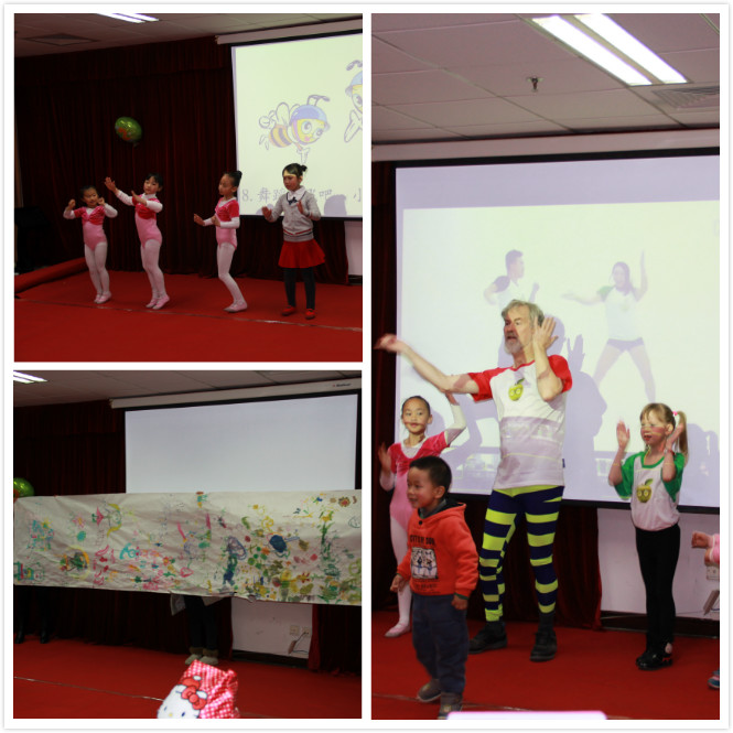在亮丽的海报签到处,大家都在签名版上留下了自己的名字,并拿取了号码牌,不一会,小小主持人就开始主持啦,同时也预示着年会也正式开始啦!首先是暖场节目,由一名家长给大家表演朝鲜族舞蹈桔梗谣,精美的衣服,优雅的舞蹈,很快就征服了现场的观众,赢得了片片掌声。将大家的兴奋度提到了一个小高潮,接下来就是孩子们的表演,有小马过新年的群舞,有可爱的飞扬的小蜜蜂,有深情并茂的诗歌朗诵,还有一招一式都很像回事的跆拳道表演,特别要提到的是一个才两岁多的小朋友,居然还敲起了小锣鼓,惹人怜爱。这些节目无一不展现出孩子们的天真与可爱,表演虽然不是那么的专业,但是孩子们还是赢得了每一个人的掌声,那种紧张但有想表演好的干劲也着实打动了大家。同时联欢会也邀请到了上海大学折纸社的社长以及研究生为大家表演折纸和精彩的魔术,孩子们非常喜欢这两个节目,目不转睛地看着大学生的表演,结束后还不停地追问他们。“怎么做呀,这么做对不对呀,也教教我吧”的声音此起彼伏。随后表演继续跟上,尤其是最后压轴,外教一家人的一曲小苹果再次high翻全场,全场观众都站起来为他们欢呼,跟着节奏一起打拍子。那天恰逢也是三位小朋友的生日,大家一边唱生日歌,一边为他们庆祝。晚会在温馨和谐的场景中结束。联欢会现场也贯穿了一系列抽奖环节,高潮一个个迭起,孩子们拿到了自己心仪的礼物都非常开心。联欢会还进行亲子现场绘画展示,美术学院的老师现场进行了指导,联欢会的最后展示了这幅长达几米的涂鸦式画卷,也展示了我们上海大学老师的浓浓亲子之情。