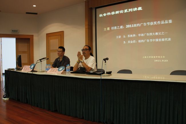 2011年9月23日下午,影院社科新论讲座在校本部J103举行。本次讲座邀请了华语广告四大教父之一的"老顽童"苏秋萍大师和2010纽约广告节中国首席代表吴金君先生,共同给大家带来了一堂"惊艳"的讲座。