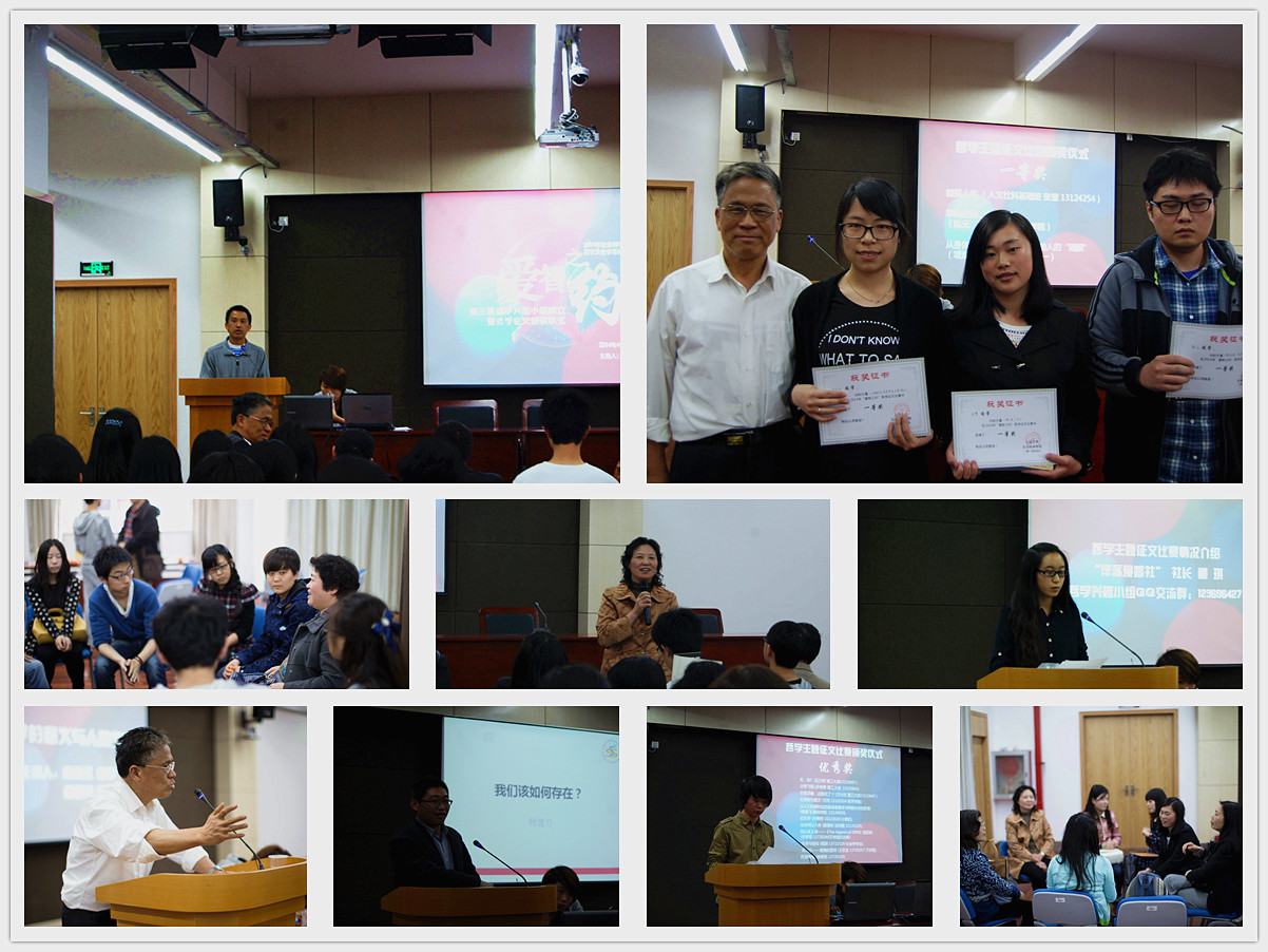 4月11日,社科学院第二届"爱智之约"哲学征文比赛颁奖暨哲学兴趣小组成立大会在新世纪大学村社区学院13幢2楼多功能厅顺利举行。活动由社科学院哲学系刘友古老师主持,哲学系陈新汉、宁莉娜教授等教师以及学院团委书记陆耀峰出席了本次活动,社科学院学生代表、第二届征文比赛部分参赛者、第三届哲学兴趣小组成员以及"泮溪爱智社"成员参加了本次活动。